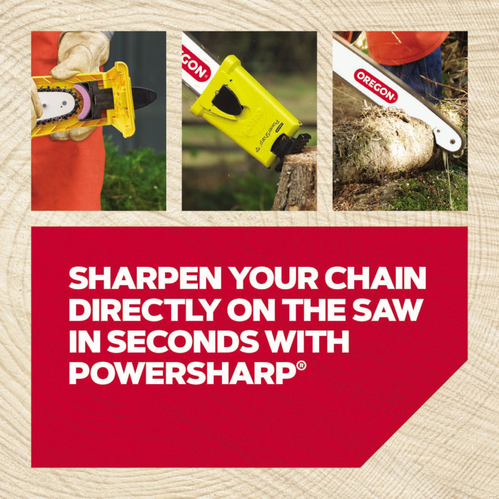 Urobte ďalší skok v technológii pílových reťazí. PowerSharp je ľahko použiteľný, presný ostriaci systém, ktorý dáva používateľom reťazových píl možnosť zaostriť reťaz v priebehu niekoľkých sekúnd, pomocou ľahko použiteľného nadstavca. PowerSharp® reťaz je vhodná aj pre profesionálnych užívateľov, ktorí chcú byť pri práci produktívnejší. Profesionáli dosiahnu presných a ako britva ostrých hrán rýchlo a jednoducho. Vďaka systému PowerSharp môžete teraz ostriť reťaz priamo na píle. PowerSharp je systém, ktorý zahŕňa reťaz PowerSharp, vodiacu lištu PowerSharp (nie je súčasťou dodávky) a brúsku na montáž na lištu (nie je súčasťou dodávky); Poskytujú rýchlu, jednoduchú a prenosnú metódu presného ostrenia reťaze píly.